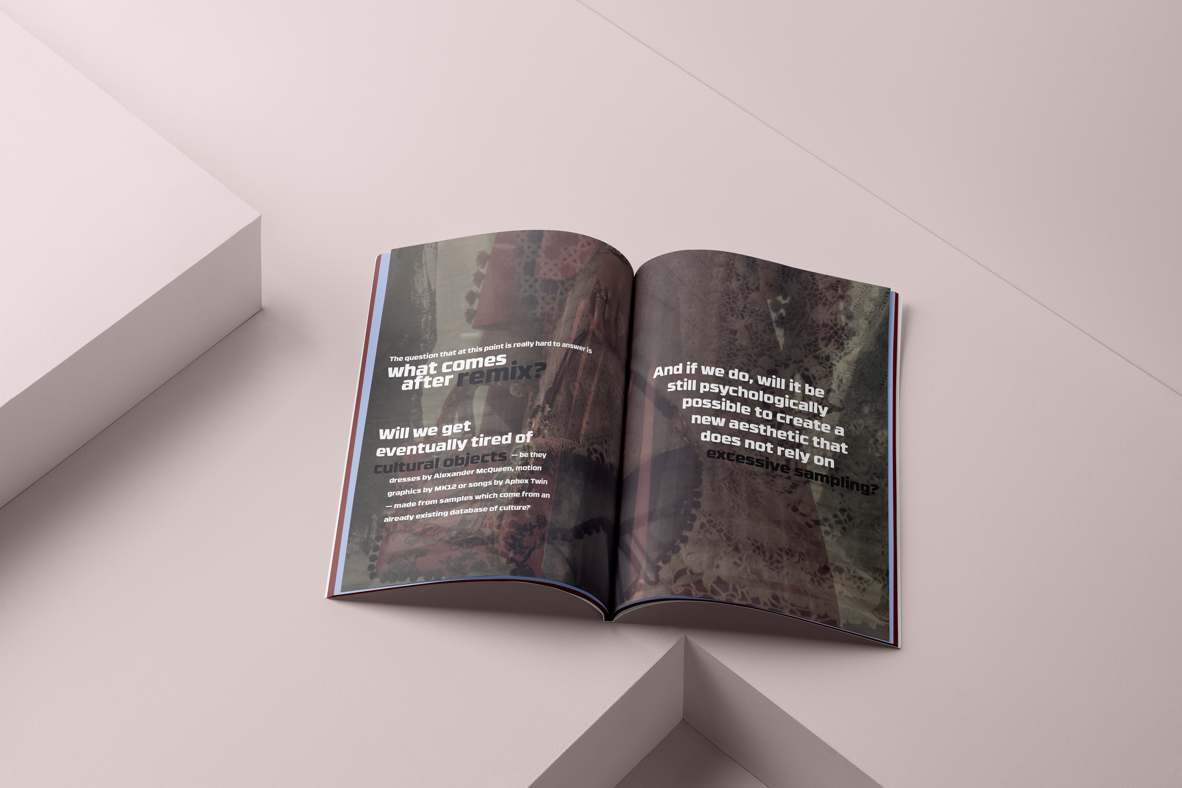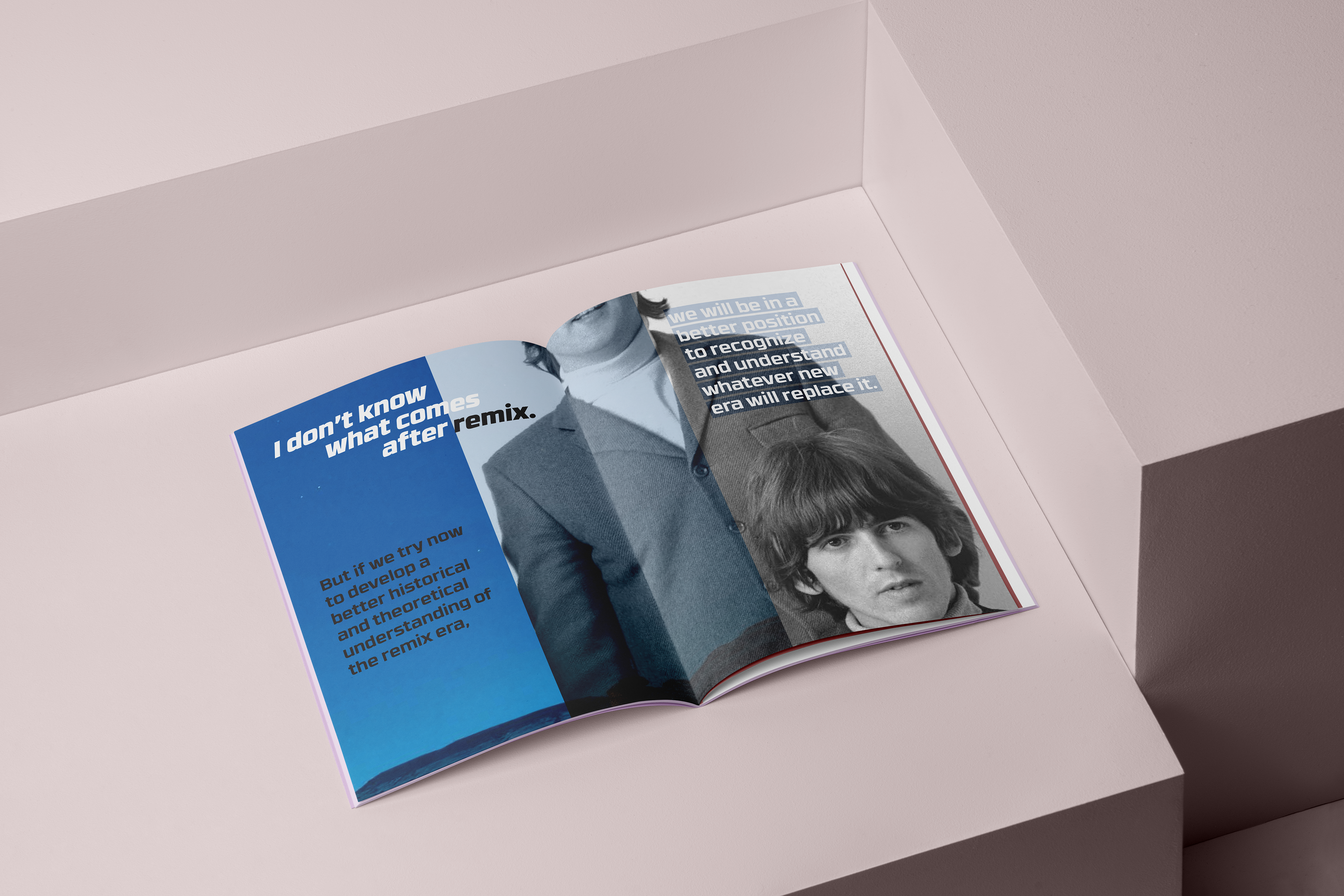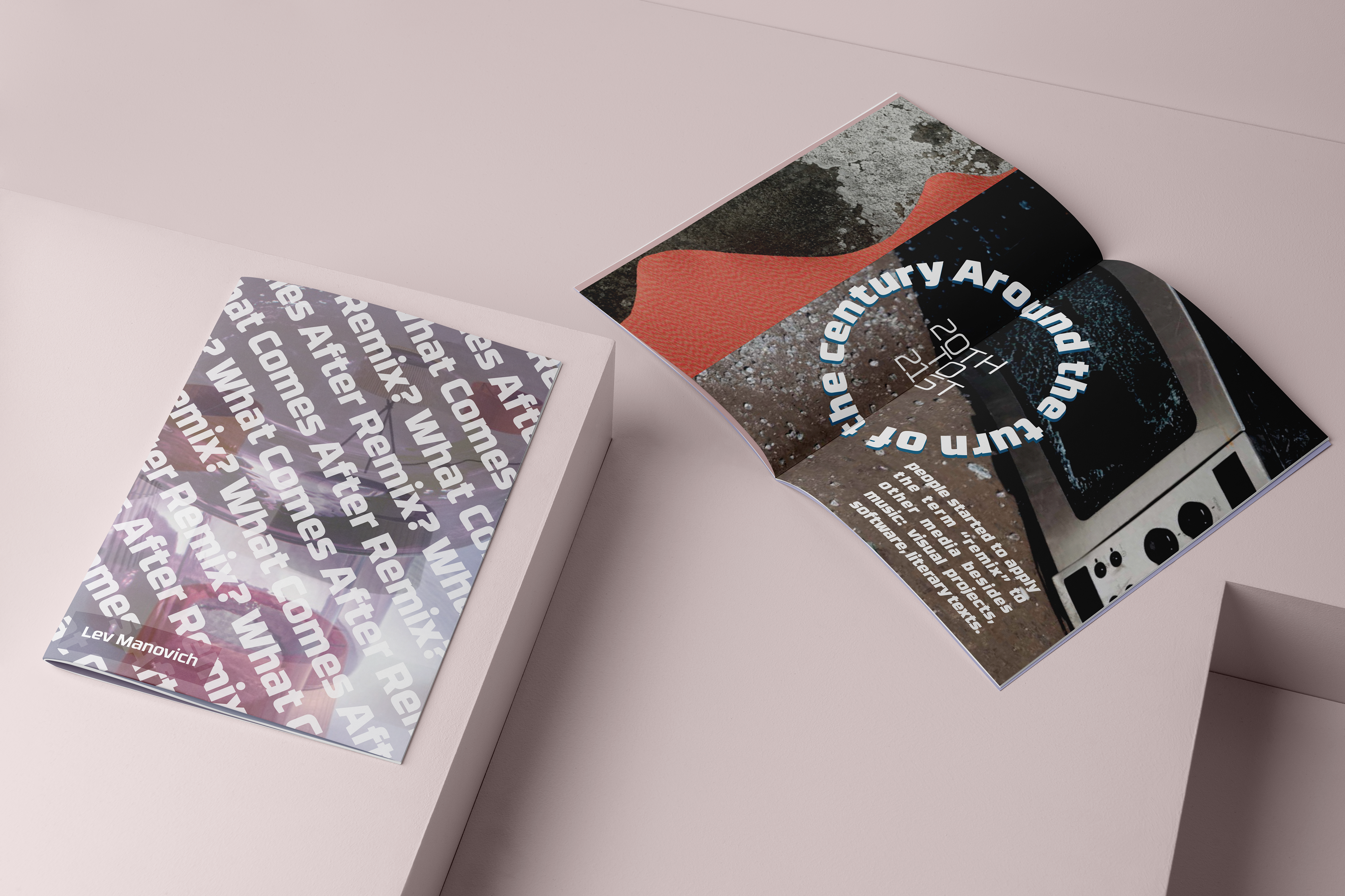 This book was created using an article by Lev Manovich titled, “What Comes After Remix?” It is heavily designed around the concept of remixing and enhancing the experience of the reader with new elements created with old things.
